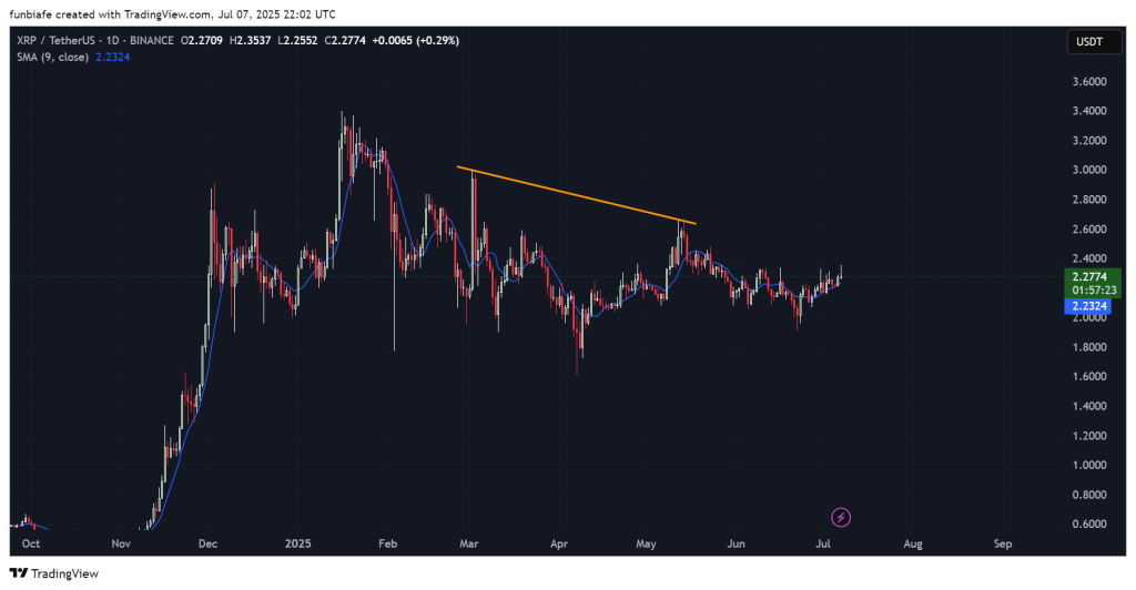 XRP الرسم البياني كان يتقلب مؤخراً بين 2.00 دولار و 2.60 دولار. كلما حاول الارتفاع، كان يتعرض للضرب من خط الاتجاه الهابط منذ فبراير.
