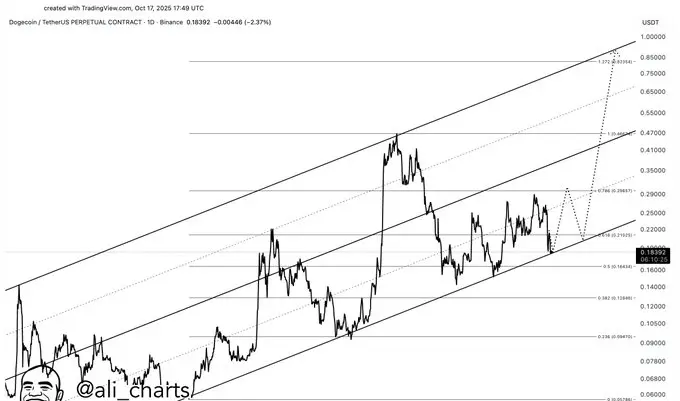 لاحظ المحلل أن عملة دوجكوين تتداول ضمن قناة متوازية صاعدة تمتد إلى أوائل عام 2023. دوجكوين حاليًا تحوم بالقرب من الحد السفلي لهذه القناة، وهي منطقة عملت تاريخيًا كمنصة انطلاق موثوقة للارتفاعات.