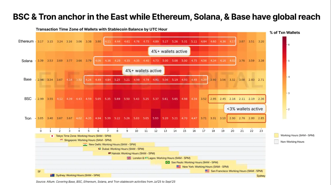 Concernant les réseaux blockchain utilisés, les résultats de l'étude montrent une utilisation mondiale équilibrée pour Ethereum et Solana, mais avec une forte activité pendant les heures de travail dans les hémisphères Est (EST 2–6) et Ouest (EST 8–11). Cependant, Tron, qui gère une part importante des transactions USDT, et BSC sont plus concentrés en Asie, au Moyen-Orient et en Afrique.