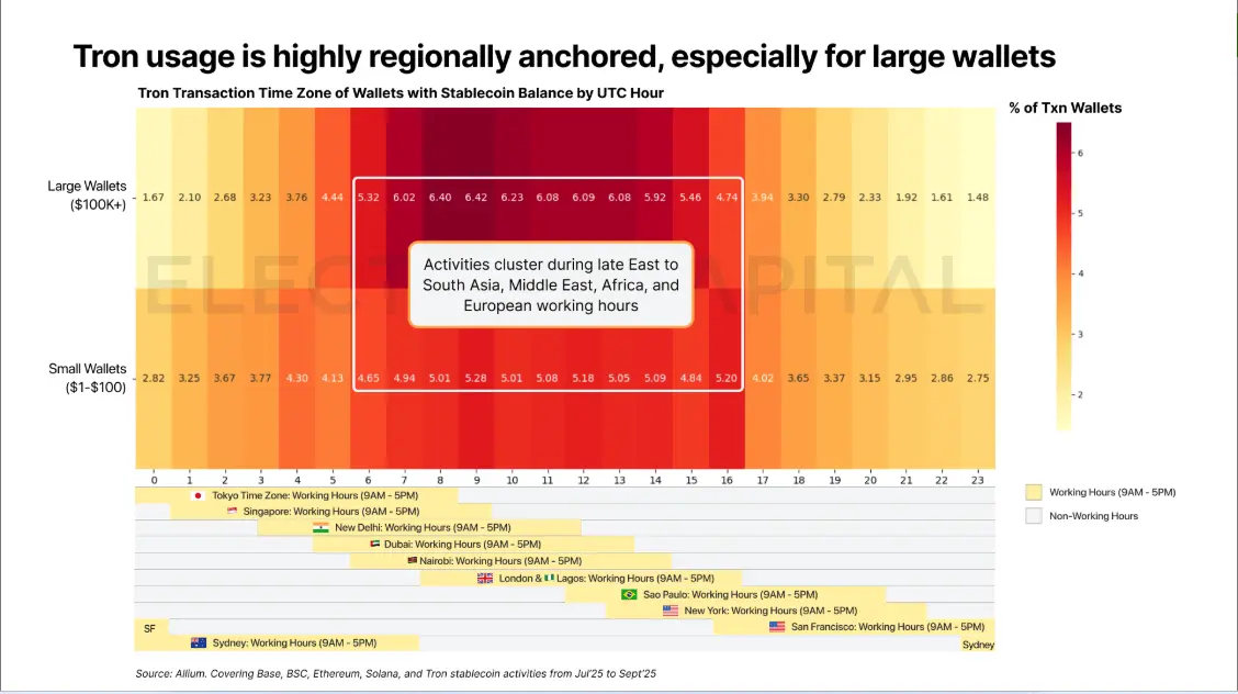 Base présente la division géographique la plus prononcée, avec des petits portefeuilles penchés vers l'Est et des grands portefeuilles vers l'Ouest. Pendant ce temps, BSC reste ancré dans l'Hémisphère oriental avec une activité limitée aux États-Unis, et Tron montre une concentration régionale encore plus forte, notamment parmi les grands portefeuilles.