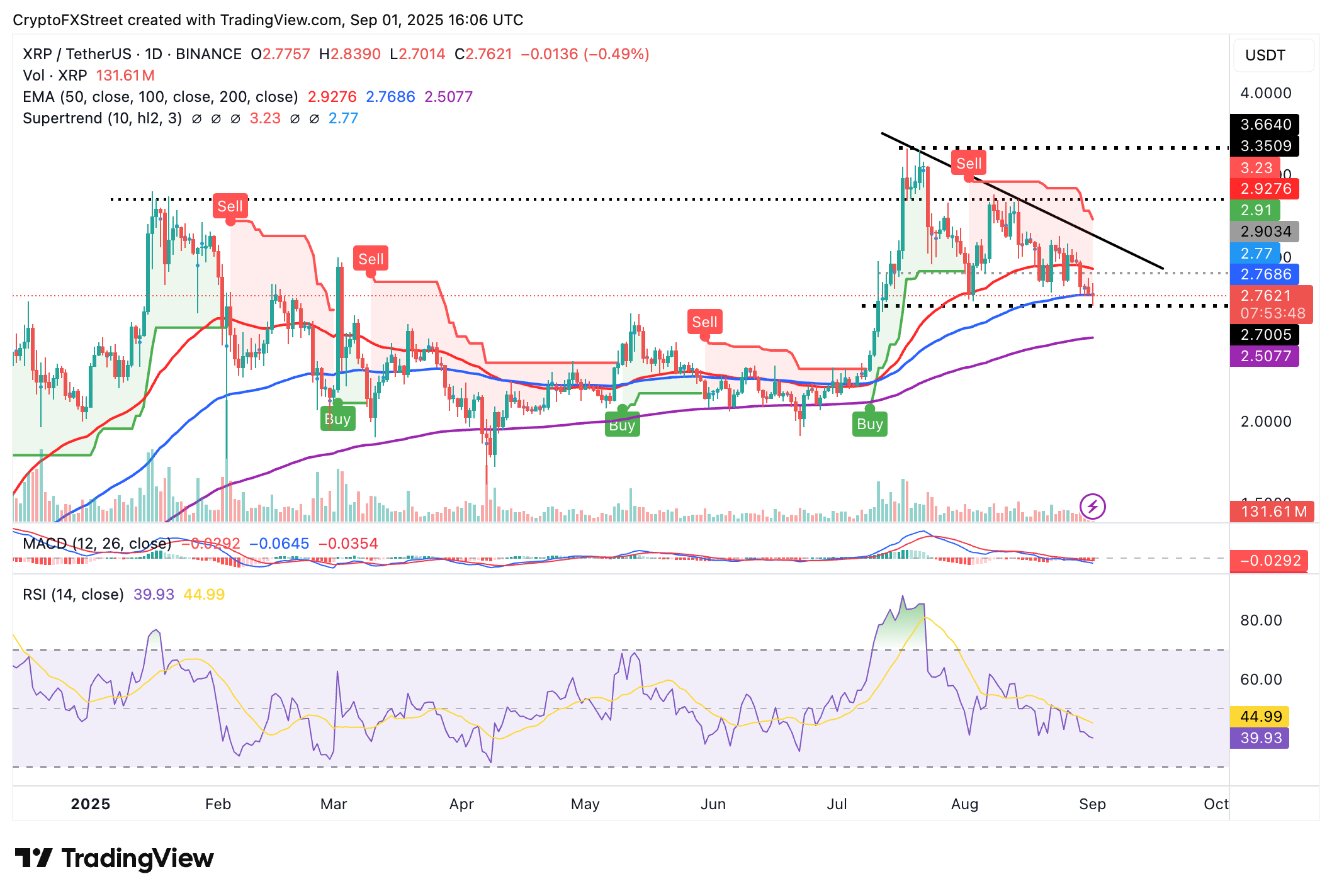 リップル価格予測:9月下落感情が高まる中、XRPは2.76ドルの重要なサポートを守ることができるのか?