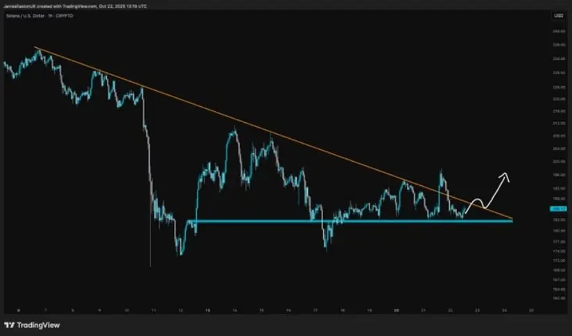 技術的には182ドル付近で強さを示し続け、買い手は構造を守るために何度も参入しています。Jamesは、価格が長期的な下降トレンドラインに従っており、まもなく来る突破区域に向けて密接に収束しているようだと指摘しています。ソラナは182ドル付近のサポートを維持しており、強気派は200ドルから210ドルの抵抗を突破する可能性を楽観視しています。