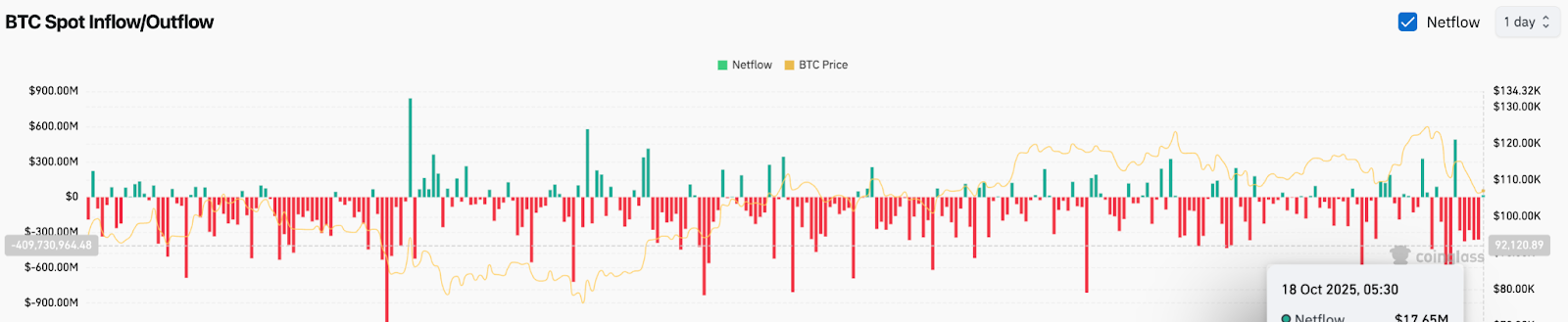 トレーダーは慎重にエクスポージャーを再構築していますが、10月初旬からの持続的な流出は、利益確定と機関投資家の需要の減少を示しています。持続的な流入が再び現れるまで、市場は技術的な安定にもかかわらず防御的な状態が続く可能性があります。