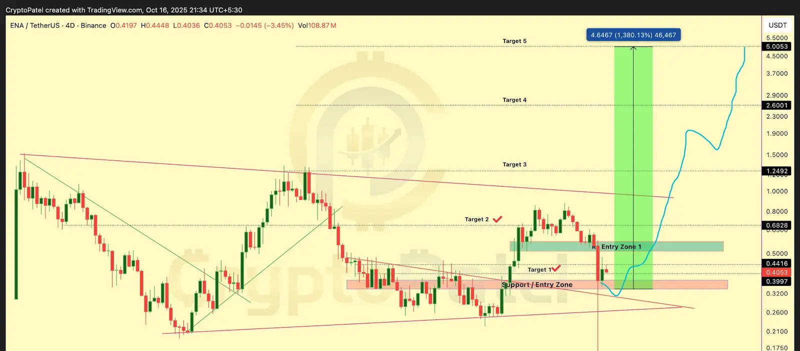 長期的には、市場アナリストのCrypto Patelは、ENAの価格がこの強気相場の終わりまでに$5 に達する見込みであると指摘しました。