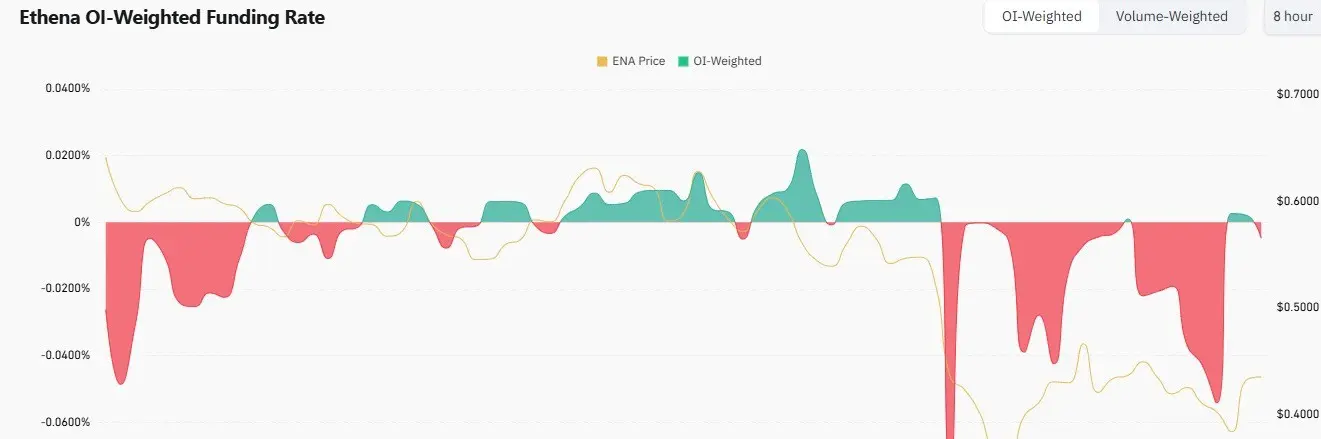 今日の注目すべきENA価格の反発は、部分的にトークン市場の動向に影響されました。市場データ分析によると、ENAのファンディングレートは最近、マイナスに転じました。歴史的に、ファンディングレートがマイナスであることは、弱気のセンチメントに関連しており、その逆もまた然りです。