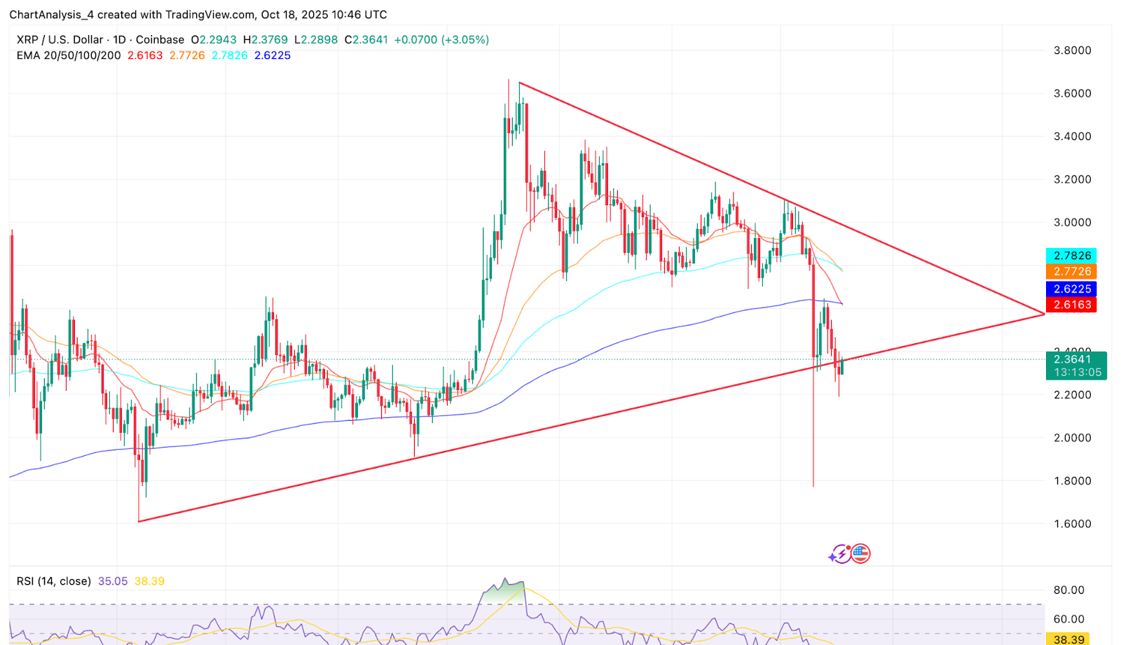 今日のXRP価格は$2.36付近で取引されており、買い手が$2.28付近の長期サポートラインを守る中、先週の急落から回復しています。重要な指数移動平均を下回った後、(20日が$2.61、50日が$2.77、100日が$2.78)で、トークンは現在、対称三角形構造内で短期的な勢いを取り戻そうとしています。