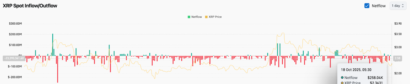 取引所のデータは、10月18日に25万8千ドルの控えめな純流入を示しており、複数日の流出の連続が終了しました。規模は小さいものの、この増加は売り手が現在の水準付近で圧力を和らげている可能性を示唆しています。歴史的に見ると、構造的サポートでの小さな流入の増加は、XRPの短期回復と一致してきました。