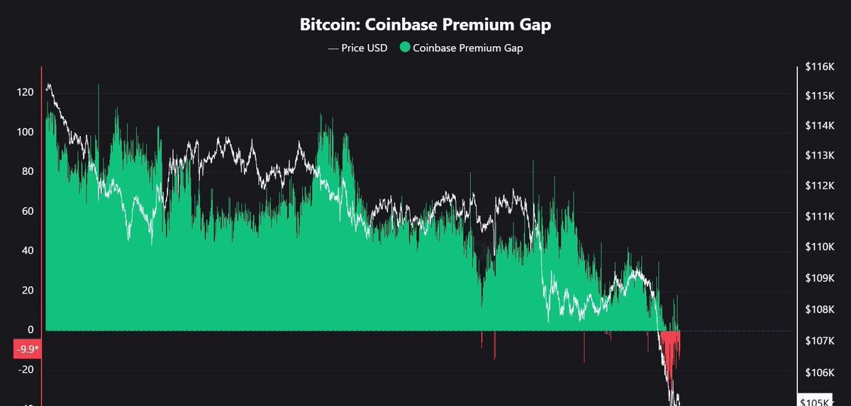 コインベースプレミアムギャップは、ビットコインに対する米国の投資家需要の重要な指標であり、新しいデータによるとマイナスに転じました。この変化は、ビットコインが現在コインベースでオフショア取引所と比較して低い価格で取引されていることを意味しており、米国のバイヤーが現在の水準であまり熱意を示していないサインです。歴史的に、赤いプレミアムは、機関投資家の流入減少や米国のトレーダーによる利益確定を反映することがよくあります。しかし、ビットコインが新たな史上最高値に達する前の今年の3月から4月の間にも同じパターンが現れ、60%の大幅な上昇を見せました。チャートは、ビットコインの価格が$105,000前後で推移し、需要が数日間冷却した後、プレミアムがゼロを下回る様子を示しています。アナリストは、このようなネガティブな読みが必ずしも長期的な下落を意味するわけではなく、むしろ再び勢いを取り戻す前の蓄積や投資家のためらいの段階を示す可能性があると述べています。ビットコインが半減期後のサイクルにおいて歴史的にボラティリティの高い段階に入る中、トレーダーたちはこのシグナルが再び強力な回復の前触れとなるのか、または深刻な修正を確認するのかを注意深く見守っています。