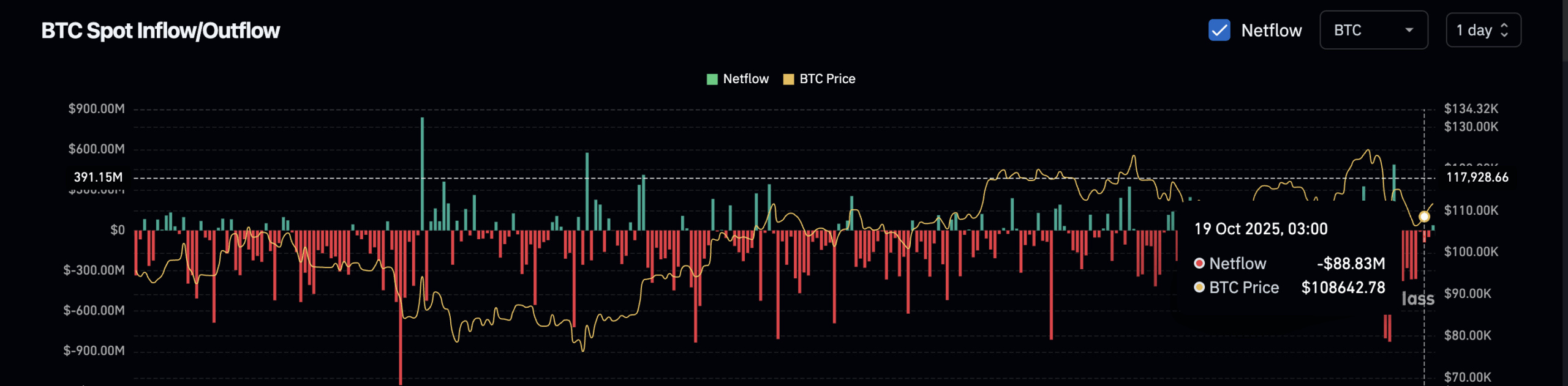 オンチェーンデータは技術的な楽観主義を強化しています。ビットコインは10月19日に取引所から8800万ドルの純流出を記録し、より多くの通貨が取引のために保持されるのではなく、コールドウォレットに引き出されていることを示しています。この行動は通常、長期保有者(LTHs)による蓄積と見なされ、市場供給を減少させ、時間の経過とともに価格に上昇圧力をかける傾向があります。