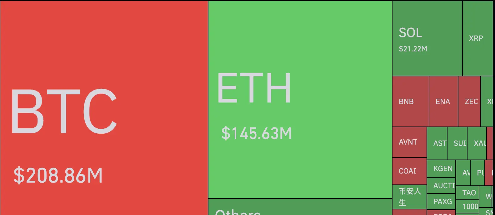清算ヒートマップは劇的な状況を描いています:過去24時間で$525 百万のレバレッジポジションが消失しました。ビットコインはその数字のほぼ$210 百万を占めており、ショートポジションが大部分を占めて$120 百万です。