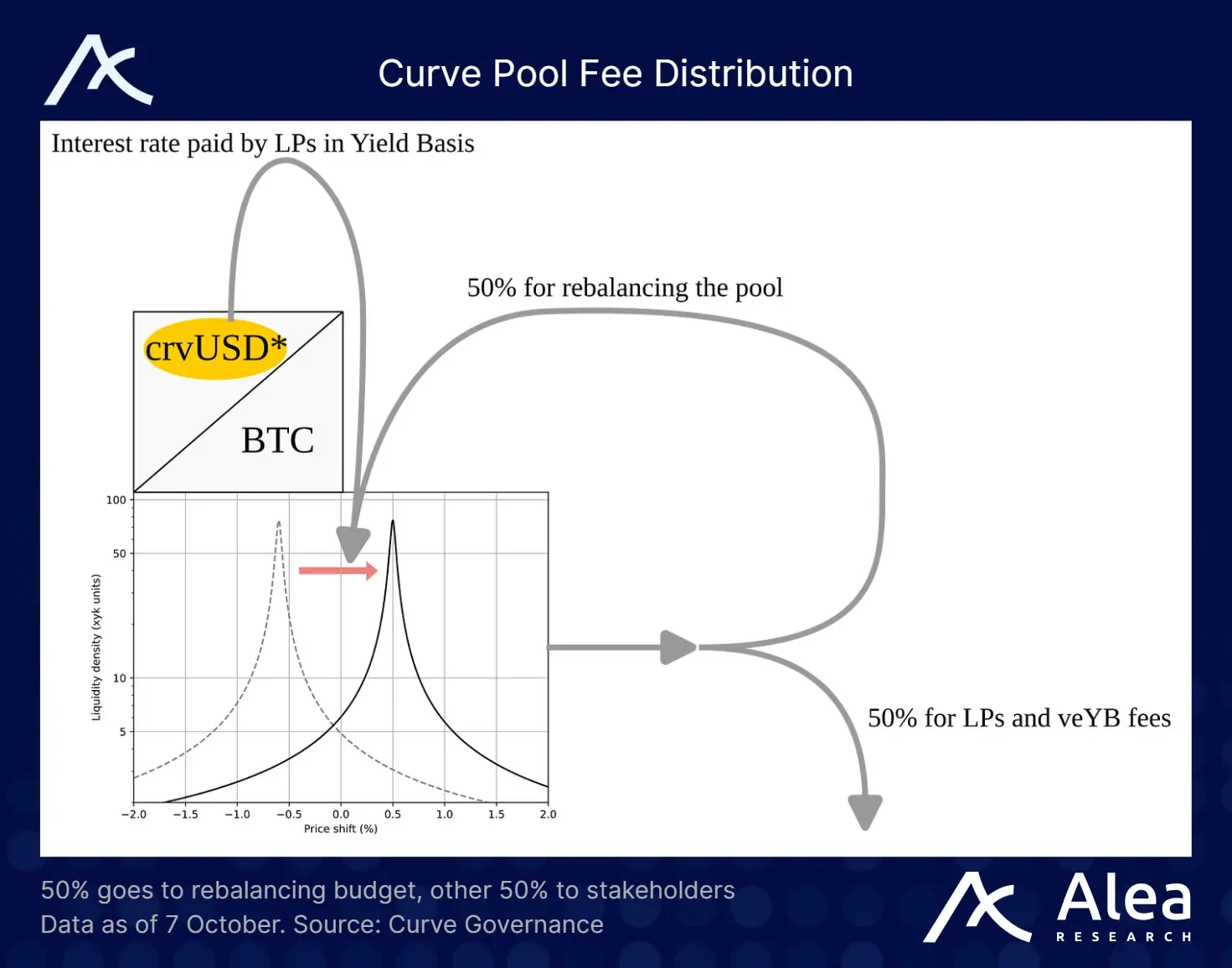As taxas de transação do pool BTC/crvUSD são fornecidas aos provedores de liquidez YieldBasis (LP) e detentores de veYB na forma de uma taxa de gestão dinâmica. Deste total, 50% das taxas são usadas para reequilíbrio, enquanto os restantes 50% são distribuídos entre os provedores de liquidez não apostados (LP) e veYB, com base na proporção de participação em ybBTC. Se muitos provedores de liquidez (LP) apostarem para ganhar a emissão de YB, a taxa de gestão aumentará, resultando em pagamentos maiores para veYB. Porém, se a quantidade apostada for menor, os provedores de liquidez (LP) receberão mais taxas cotadas em BTC.
