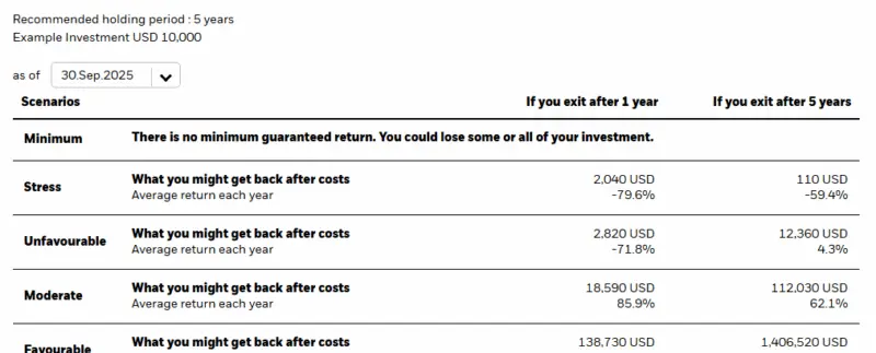 В худшем случае, при инвестиции в $10K , вы потеряете все, если рыночные условия ухудшатся. В лучшем случае вы можете вернуть более 1,4 миллиона долларов, если выйдете через 5 лет, или 138 730 долларов, если выйдете всего через год.