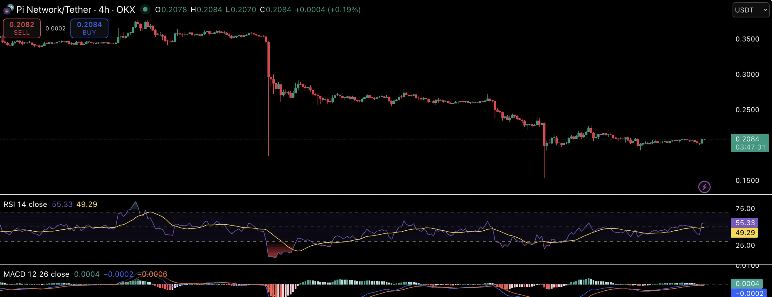 На момент написания, Pi торгуется вокруг $0.2077 с рыночной капитализацией $1.72 миллиарда. RSI находится около 54, в то время как MACD показывает нейтральный кроссовер — что указывает на баланс между покупателями и продавцами.