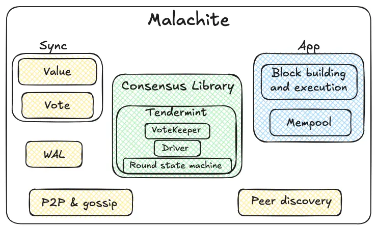 Yeşil işaretli konsensüs kütüphanesi Malachite'in temelidir. İçindeki tur durum makinesi Tendermint tarzı tur mekanizmasını (öneri → ön oylama → ön onay → onay) kullanmaktadır. Oylama koruyucusu oyları bir araya getirip yasal oy sayısını takip etmekle sorumludur. Sürücü, zaman içinde bu turları koordine ederek, bazı düğümler geciktiğinde veya arızalandığında bile protokolün karar vermeye devam etmesini sağlar. Bu konsensüs kütüphanesi, farklı türdeki uygulamaların erişimini sağlamak için “sayısal” verileri soyut bir şekilde işlemek üzere kasıtlı olarak tasarlanmış bir evrenselliğe sahiptir.