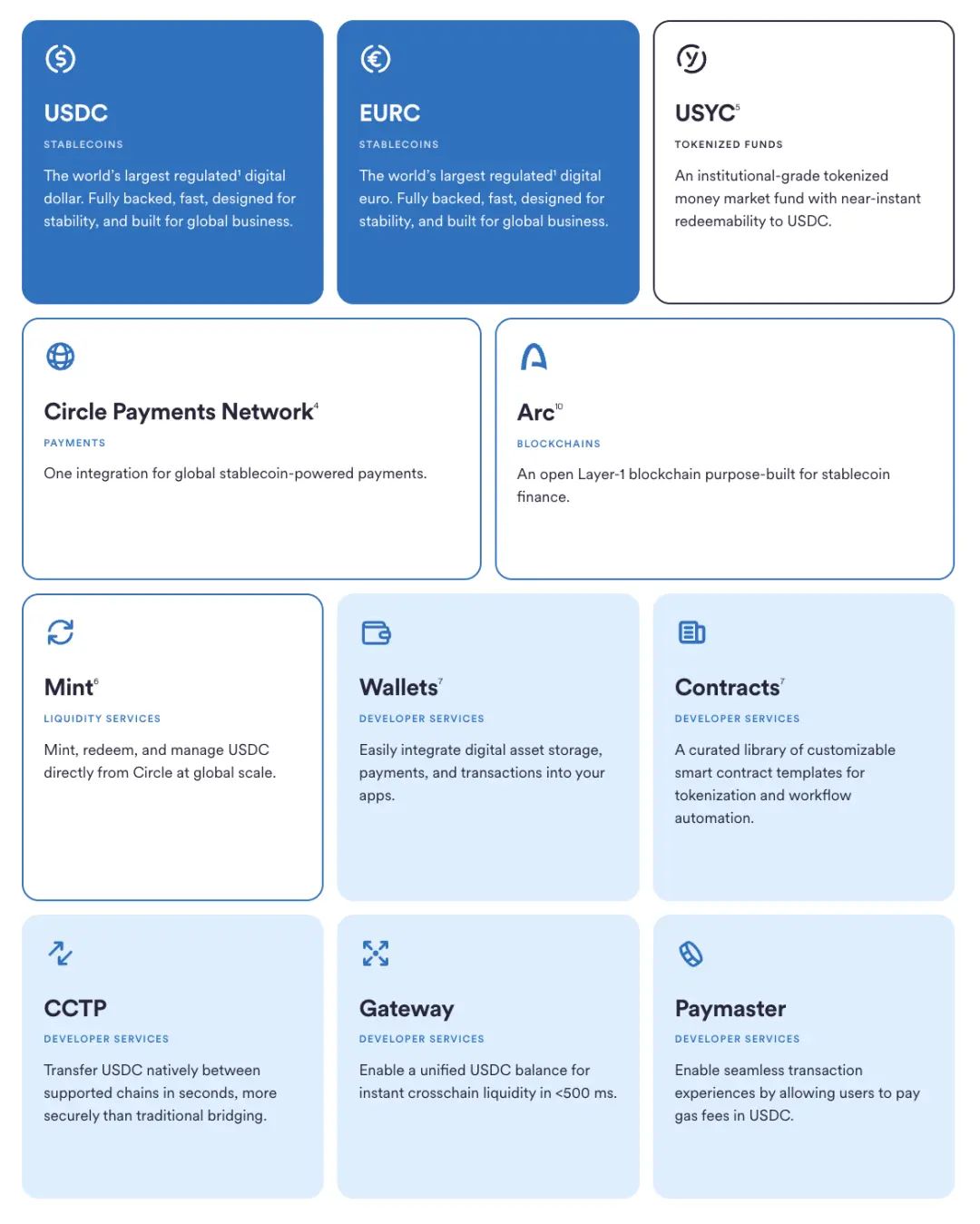Bu arada, Circle'ın ekosistem inşası temkinli ve birikimsel bir yaklaşım sergiliyor: USDC'nin ihraç ve yönetimi ile başladı, ardından Centre'i çözerek ve programlanabilir cüzdanlar sunarak kontrolü geri aldı. Sonraki adım CCTP oldu, bu da onu çapraz zincir köprülerine bağımlılıktan kurtararak yerel bir imha-basım transfer yöntemi benimseyerek çapraz zincir USDC likiditesini birleştirdi. Circle, Circle Payments Network'ü başlatarak zincir üstü değer ile zincir dışı ticareti birbirine bağladı. Arc ise bu oyundaki en son adım. Bu temel sütunların etrafında, ihraççılar ve geliştiriciler için hizmetler—Mint, Contracts, Gateway ve Paymaster (USDC cinsinden Gas ücreti)—bulunuyor; bu hizmetler üçüncü taraflara olan bağımlılığı azaltıyor ve ürün ile dağıtım arasındaki geri bildirim döngüsünü sıkılaştırıyor.