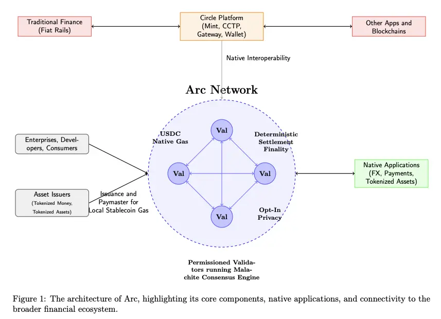 Arc'ın temel özellikleri şunlardır: Bir izinli doğrulayıcı kümesi (Malachite BFT konsensüs motorunu çalıştıran) tarafından işletilmektedir ve kesin bir sonluluk sağlar; yerel Gas ücreti USDC ile ödenir; ve isteğe bağlı bir gizlilik katmanı sunar.
