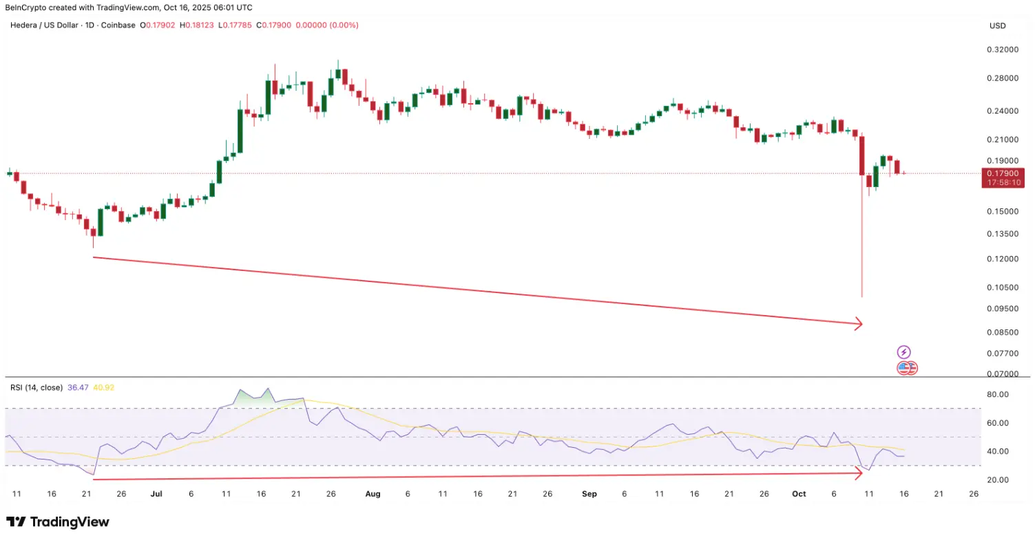22/6'dan 8/10'a kadar HBAR fiyatı sürekli olarak daha düşük dipler oluştururken, RSI ise giderek daha yüksek dipler oluşturdu — bu, satış baskısının zayıfladığını ve trendin tersine dönme olasılığının yaklaşmakta olduğunu gösteren tipik bir yükseliş ayrışma modelidir.