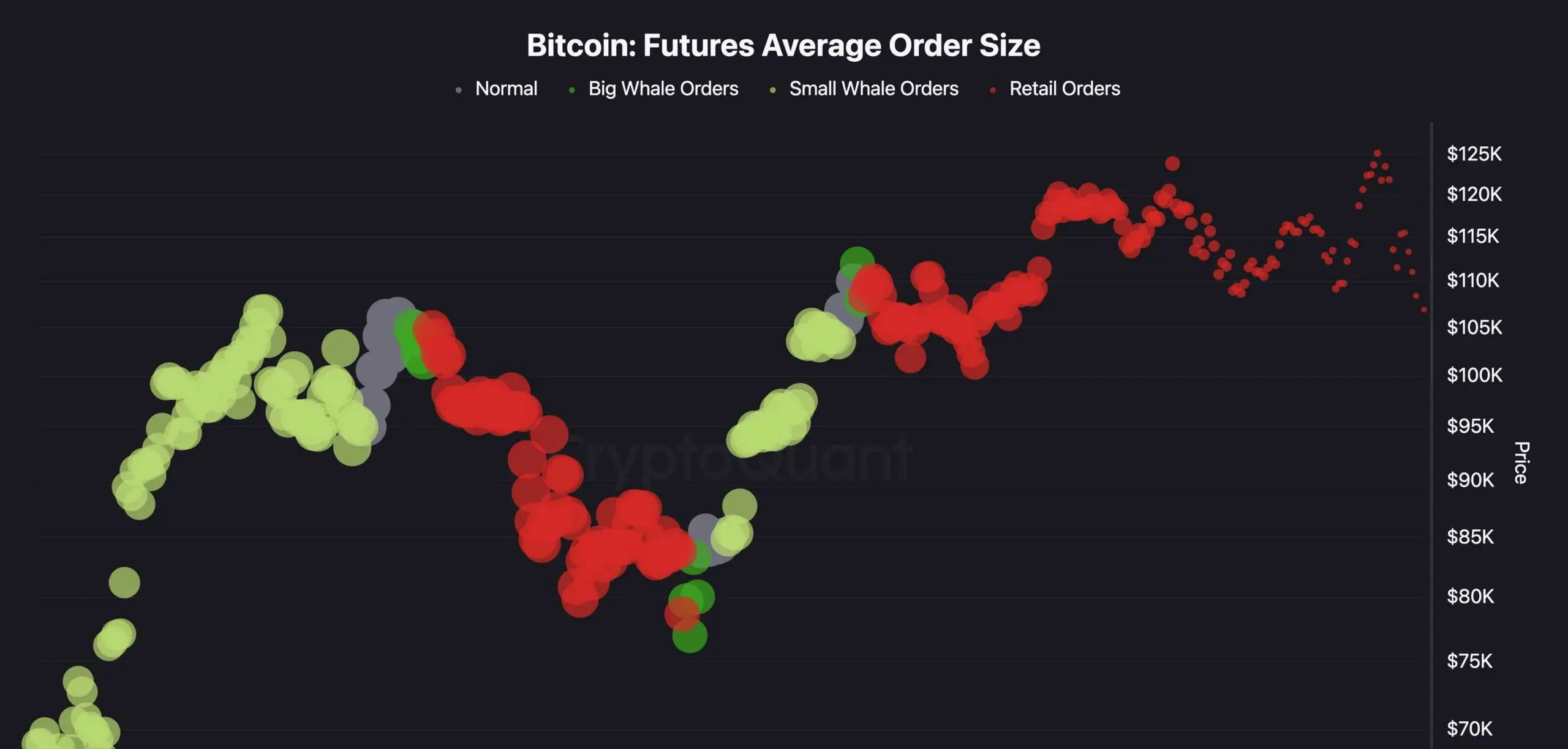 Vadeli işlem sipariş büyüklüğü verileri, son birkaç hafta içinde balina aktivitelerinden daha küçük, perakende odaklı pozisyonlara doğru dramatik bir kayma gösteriyor. Eylül'de fiyat düzeltmeye başladıkça, büyük balina siparişlerinin sayısı kaybolmaya başladı ve neredeyse tamamen daha küçük perakende işlemleri ile değiştirildi.