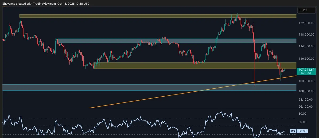 Zoom yaptığımızda, BTC'nin $105K seviyesinin ve $115K seviyesinin kırılmasından sonra $109K etrafında küçük bir taban oluşturduğu açıkça görülüyor. Varlık artık direnç haline gelen $108K-$109K bölgesini yeniden kazanmakta zorlanıyor. Ayrıca, RSI biraz sıçramakta ancak hala güçlü bir ivmeden yoksun, 38 civarında süzülüyor.