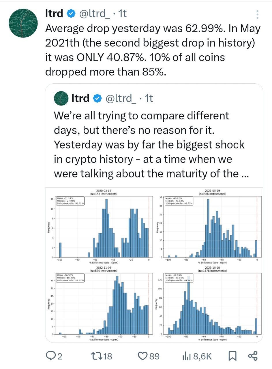 Я зазвичай використовую низьке плече (2-3x), щоб зменшити обсяг капіталу на CEX/DEX, але це дивовижно — середнє падіння альткоїнів склало 62%, а деякі просіли на 85–99%. Тобто кожен трейдер із плечем у лонг був “rekt”. За останні роки до CT прийшли найризикованіші учасники, які спочатку проривалися на Solana, а потім пробували перпи. Використання плеча стало нормою, і я сам застосовую його щодня. Можна звинувачувати трейдерів у відсутності ризик-менеджменту, але, вважаю, 2–3x — це досить консервативно. Не думаю, що плече перестануть використовувати. Через 1–2 тижні “degens” знову гратимуть, ніби нічого не сталося.