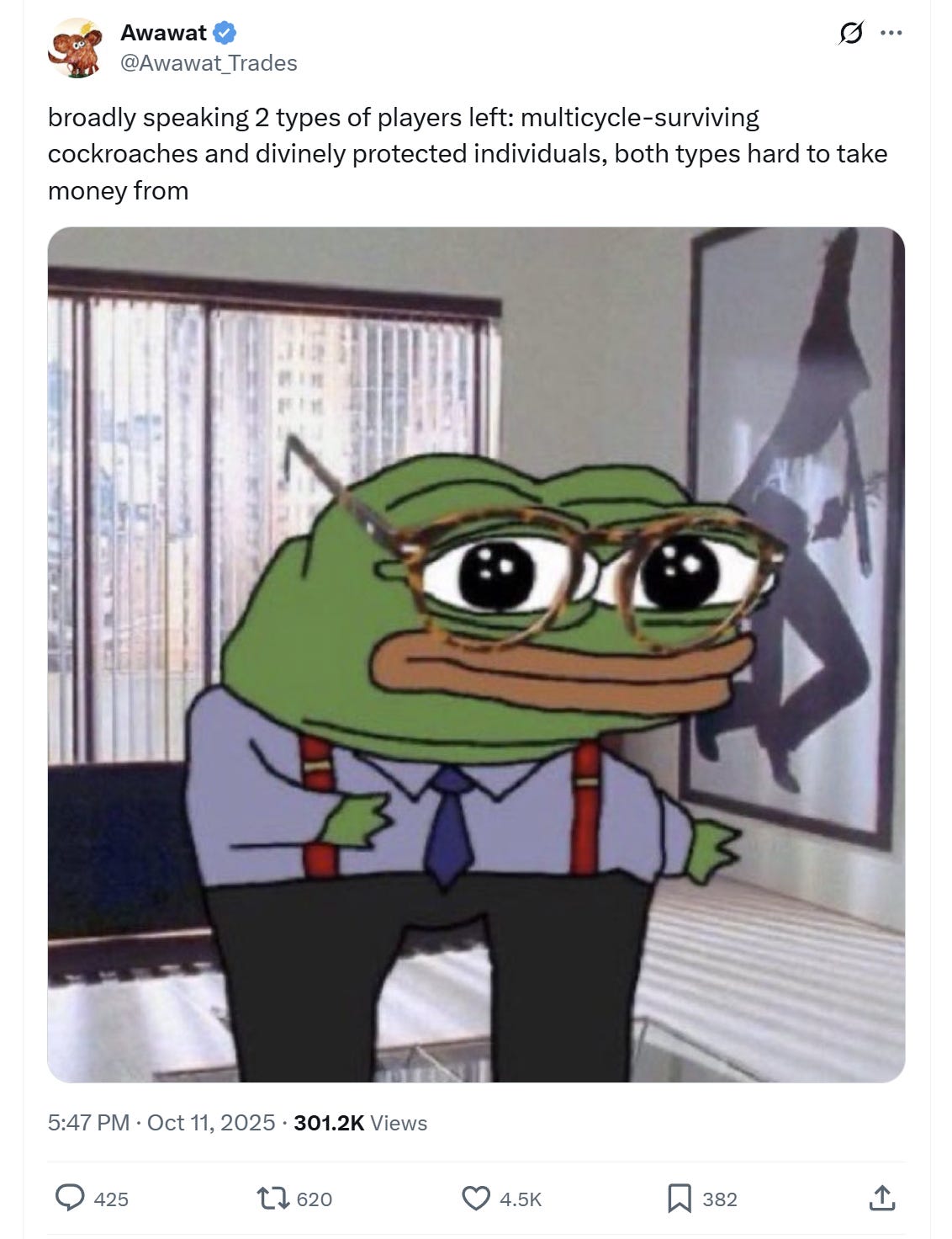 Трейдери перпів постраждали найбільше, й іронічно, багато “shitcoin trenchers” (Solana degens) тримаються непогано, оскільки зазвичай торгують монетами без плеча. Дехто зайшов у перпи, і якщо так — ймовірно, вони “rekt”. Але багато хто залишився у своїй ніші, тож втратили гроші, але не все, бо це спотові позиції.