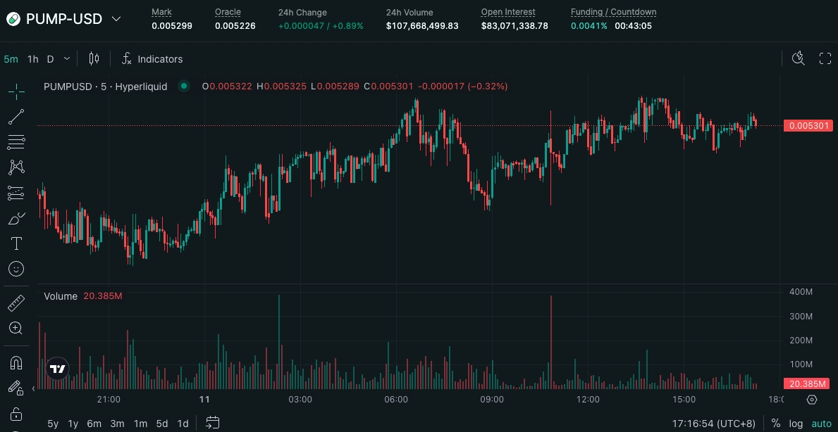 Хоча PUMP ще не випустив монету, але безстроковий контракт PUMP-USD вже доступний на децентралізованій платформі деривативів Hyperliquid. Згідно з даними Hyperliquid, позначена ціна контракту PUMP наразі становить $0.0052, що на 30% вище за ціну ICO $0.004. Протягом 24 годин після запуску контракту було зафіксовано обсяг торгів у 60 млн доларів, а загальний обсяг непогашених контрактів досяг 35 млн доларів.