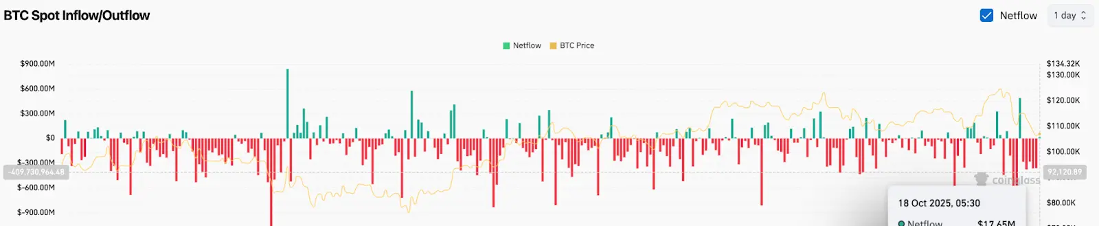 Sau gần 1,6 tỷ đô la Mỹ rút ra ròng trong năm ngày qua, dữ liệu cho thấy có một dòng tiền vào ròng khiêm tốn 17,6 triệu đô la Mỹ vào ngày 18 tháng 10, báo hiệu ngày tích cực đầu tiên trong một tuần.