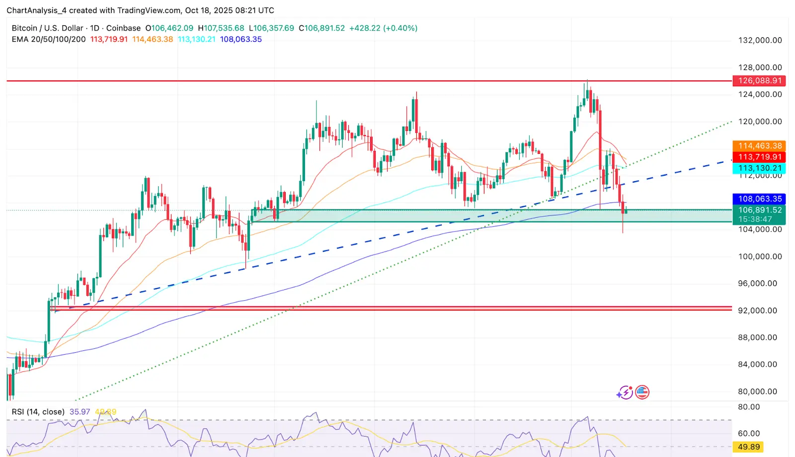 Biểu đồ cho thấy một sự phá vỡ dưới đường xu hướng tăng dài hạn từ tháng 4, đặt thiên hướng ngắn hạn ủng hộ việc hợp nhất hoặc có thể là một lần kiểm tra lại vùng thanh khoản $104,000.