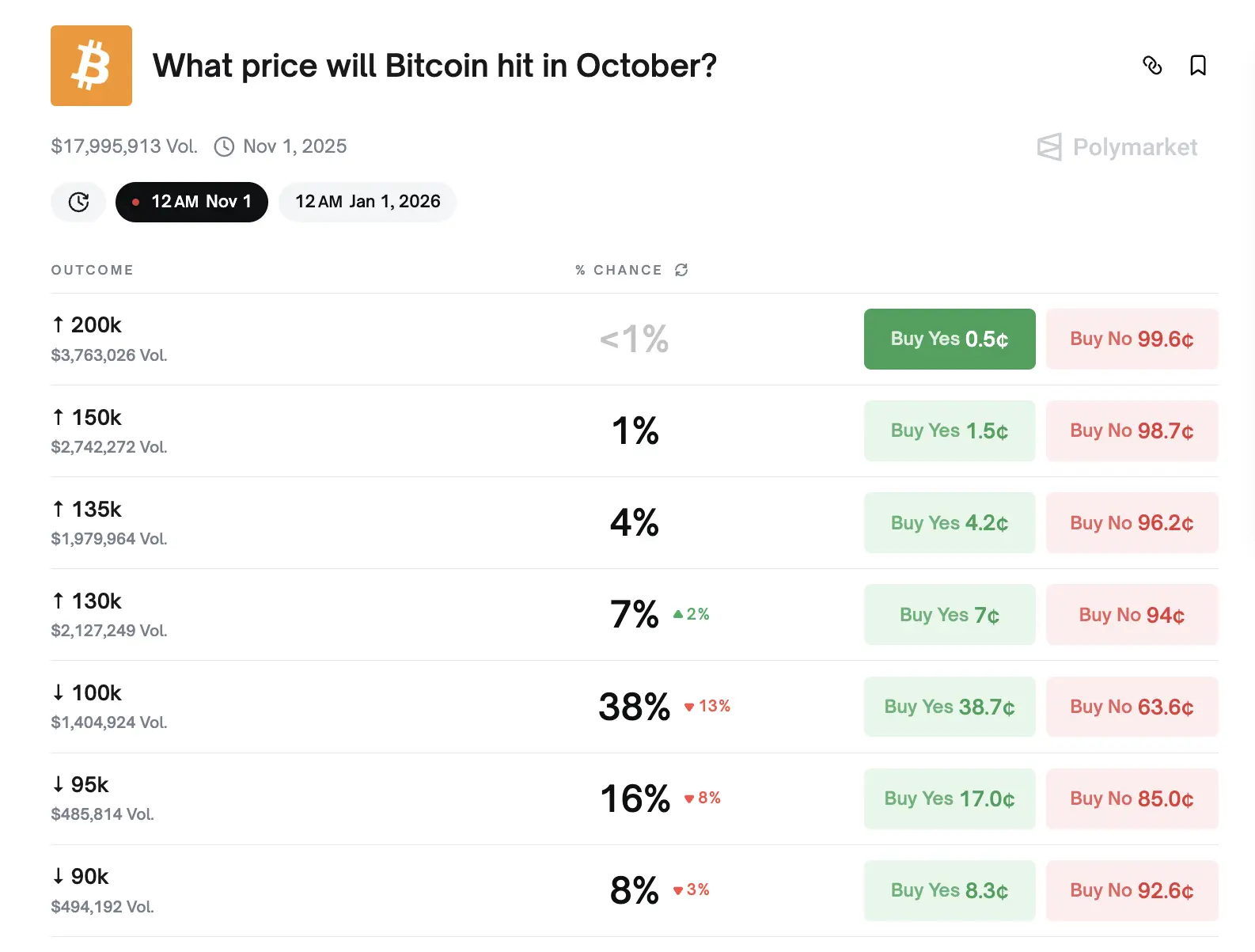 Cược Polymarket đặt xác suất 38% cho Bitcoin kết thúc tháng 10 dưới 100K đô la.