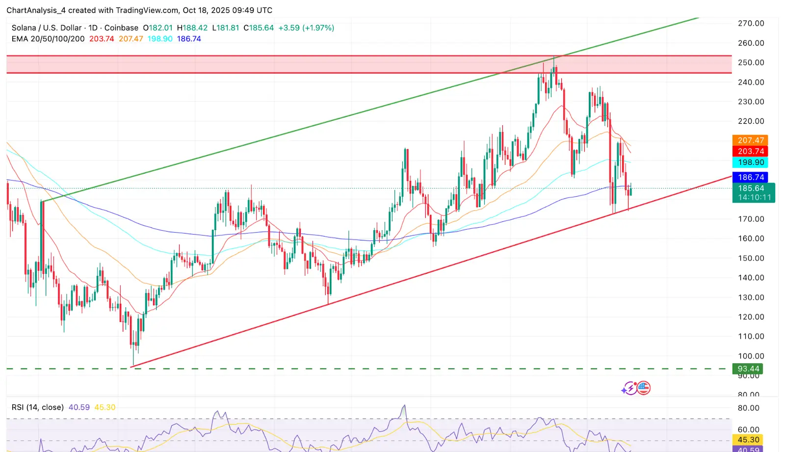 Giá Solana hôm nay giao dịch gần $185, phục hồi từ $181 hỗ trợ khi người mua bảo vệ kênh tăng đang dẫn dắt xu hướng tăng kể từ tháng Ba. Biểu đồ hàng ngày cho thấy giá giữ trên đường xu hướng dài hạn ngay cả khi EMA 20 ngày ở $203 tiếp tục giới hạn các đợt tăng ngắn hạn.