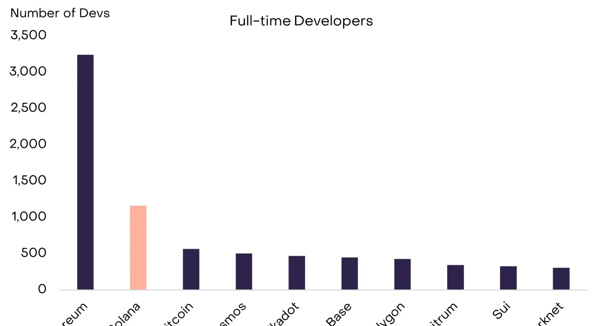 Theo dữ liệu của Electric Capital, Solana hiện có hơn 1.000 lập trình viên toàn thời gian, chỉ đứng sau Ethereum, với khoảng 3.500. Điều này đặt Solana ở vị trí hệ sinh thái phát triển nhanh nhất bên ngoài Ethereum, tăng cường sức hấp dẫn của nó như một chuỗi có khả năng xử lý cao được tối ưu hóa cho hiệu suất và khả năng mở rộng.